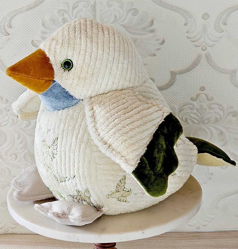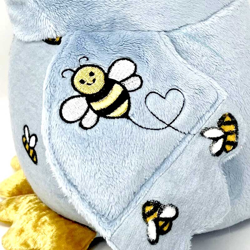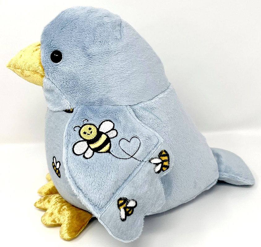 Laura Peters of Wanderchild Creations, sewed this Best Wishes BABY BIRD and added some embroidery on the wings to match the bee print on the tummy fabric she used.
