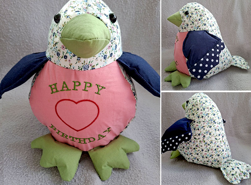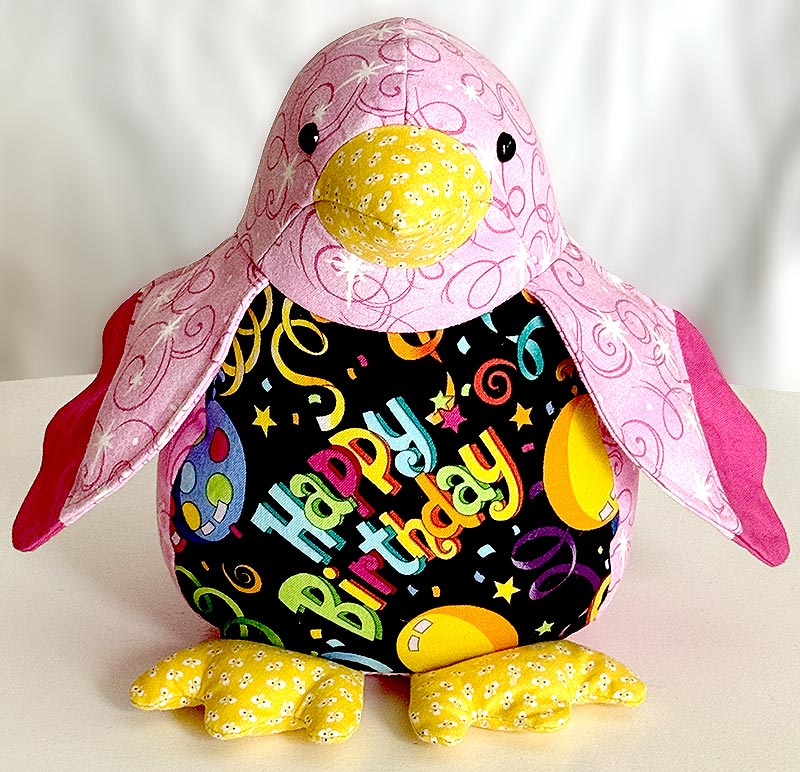 Michelle.S. used cute birthday fabric for this sweet Best Wishes BABY BIRD. I love how bright and colorful it is! This tummy fabric makes the toy a card and gift in one! If you’d like to use fabric markers to add a birthday design, I’ve included a sample layout for you in the pattern.