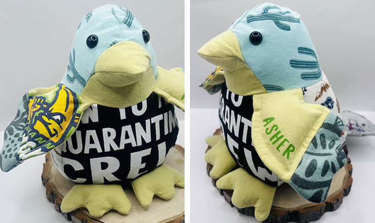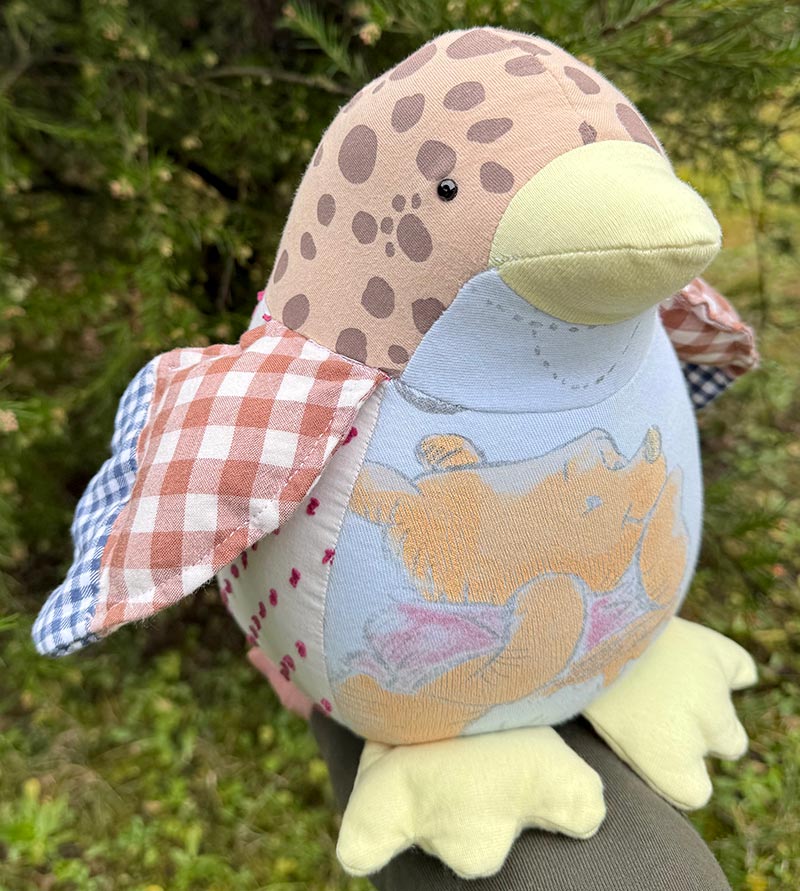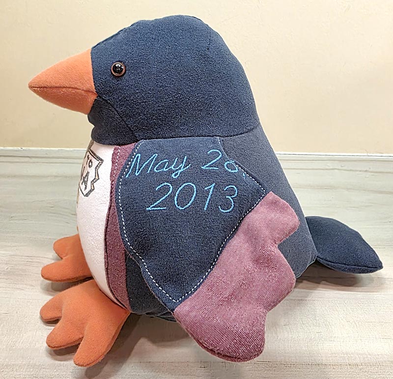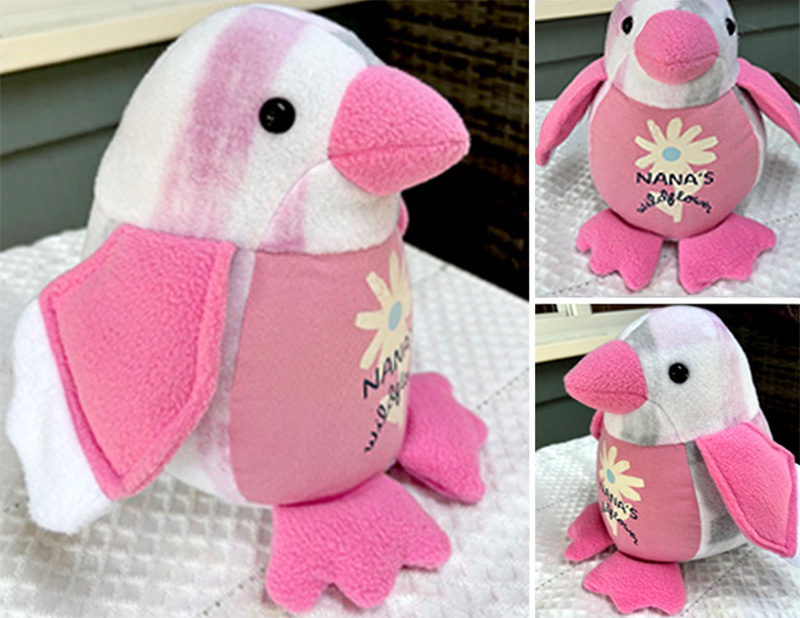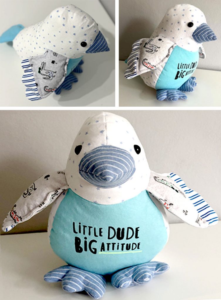 Susan.F. used one of her husband’s T-shirts to sew this very precious keepsake Best Wishes BABY BIRD. The grid patterns on the tummy and wing pieces (see up above in this blog post) make it easy to measure and center designs from t-shirts.