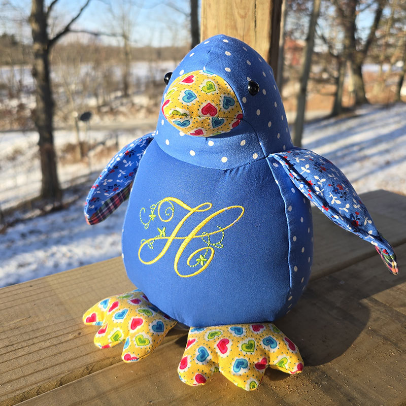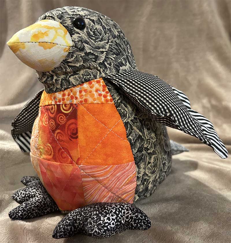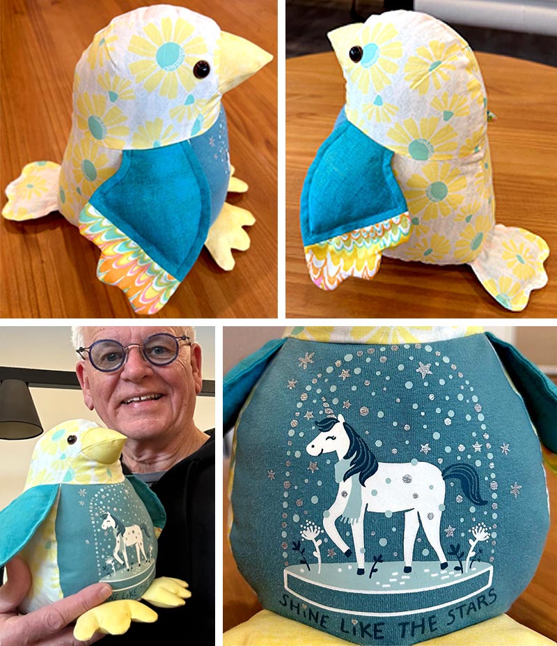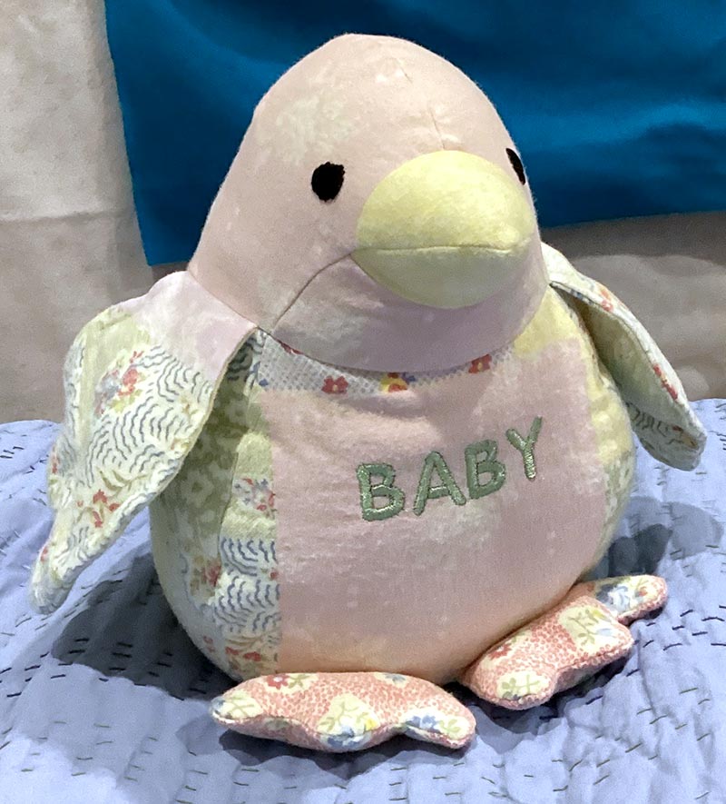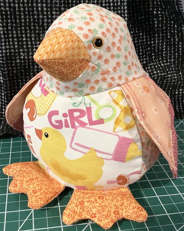 Steve Palmer sewed this Best Wishes BABY BIRD as a gift for a friend. He used used a baby onesie on the tummy and selected fabrics to compliment the colors. He didn’t have stripes to match for the wing tips, so he used a fabric that resembles feathers.