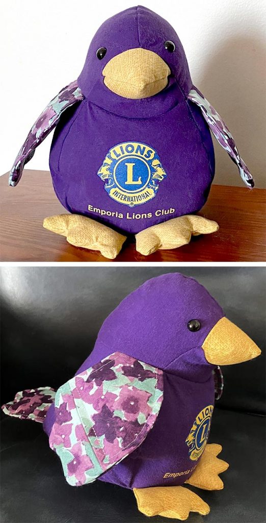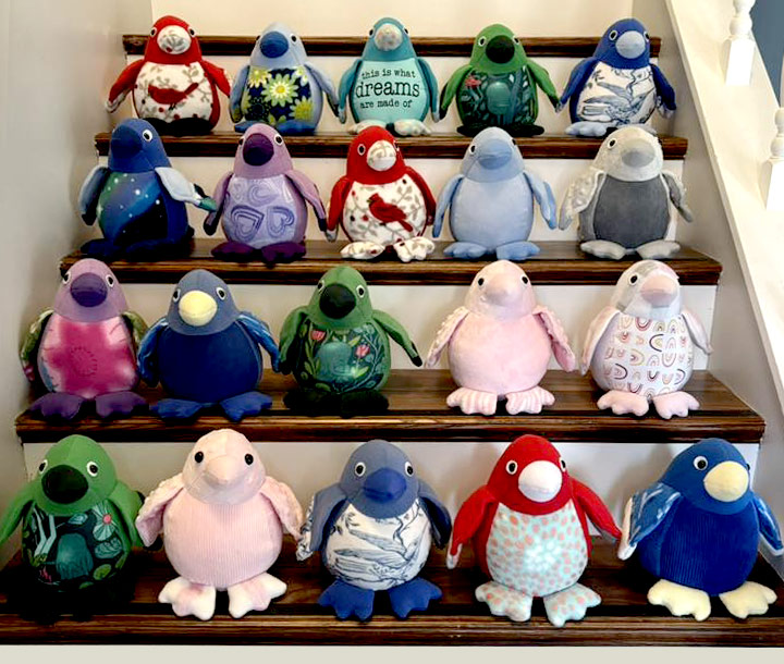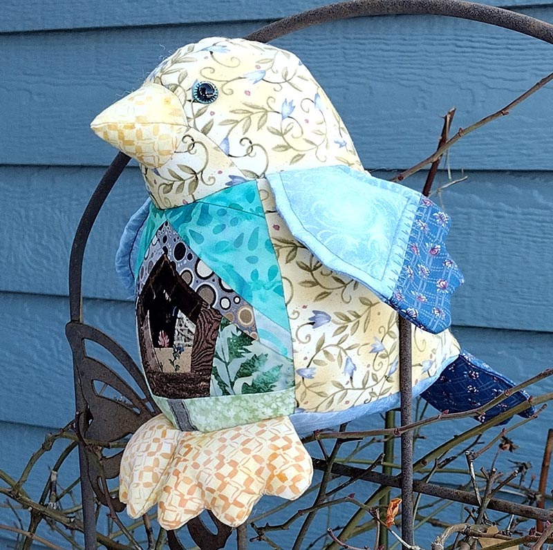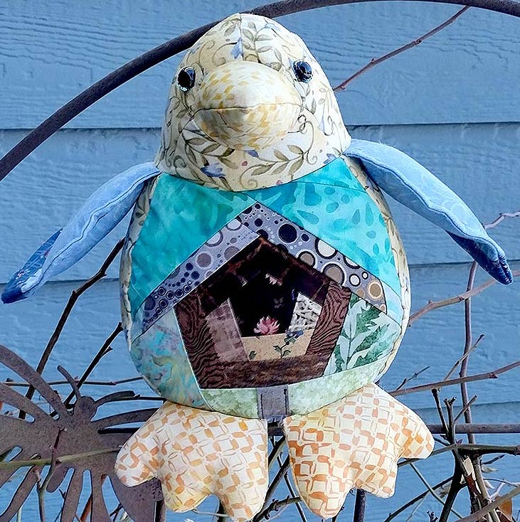 Sherry Bristol sewed this Best Wishes BABY BIRD . She said, “I sewed him for me. Enjoyed putting a quilted bird house log cabin block on the tummy. He’s so cute!” If you have an intricate quilt block but don’t want to use it in a quilt, the Best Wishes Baby Bird tummy is a great option.
