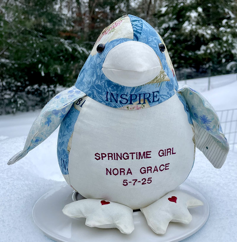 This Best Wishes BABY BIRD was sewn by Karen Long. Karen embroidered a new baby’s details on the tummy! She added matching hearts on the feet.