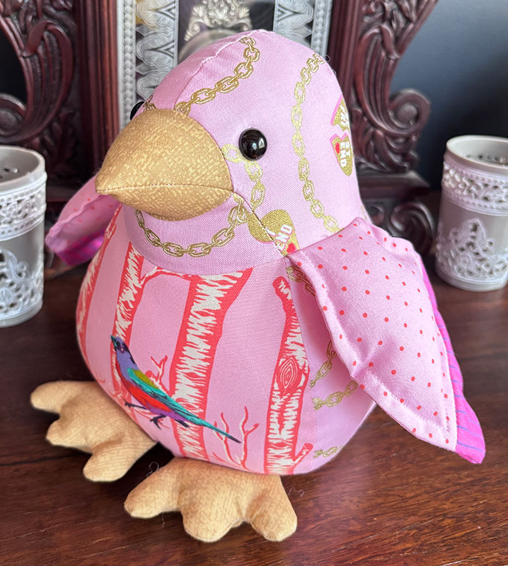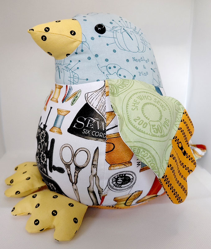Pam.G. sewed this Best Wishes BABY BIRD using a range of cute sewing-theme fabrics. I think he would make a perfect pincushion – if you don’t mind poking pins into such a sweet toy!😂