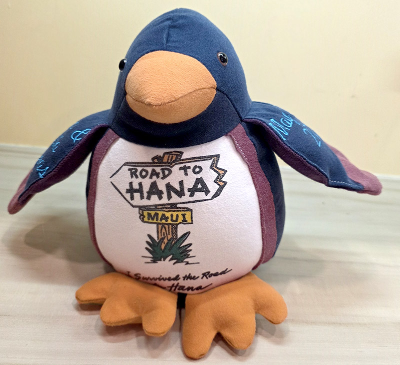 Maria Barnes sewed this Best Wishes BABY BIRD herself, with shirts from a trip with her husband. He passed in 2024 and they went to Hawaii for their 30th anniversary in 2013.