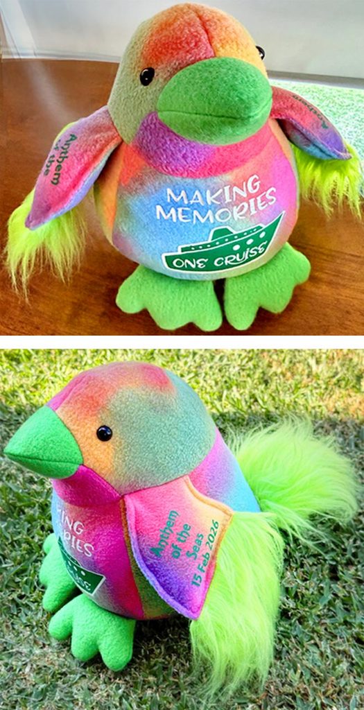 Shirley Bray sewed this Best Wishes BABY BIRD for a cruise trip she went on. The long-pile faux fur on the wing tips and tail give it a tropical vibe. Shirley used the tummy for her main image and put other details on the wings.