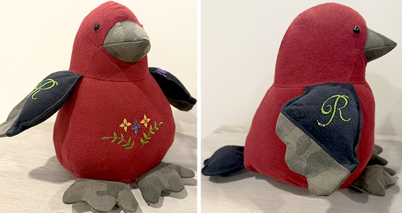 And Aicia Rice sewed this Best Wishes BABY BIRD out of her husbands favourite shirt and embroidered his initial on the wing.