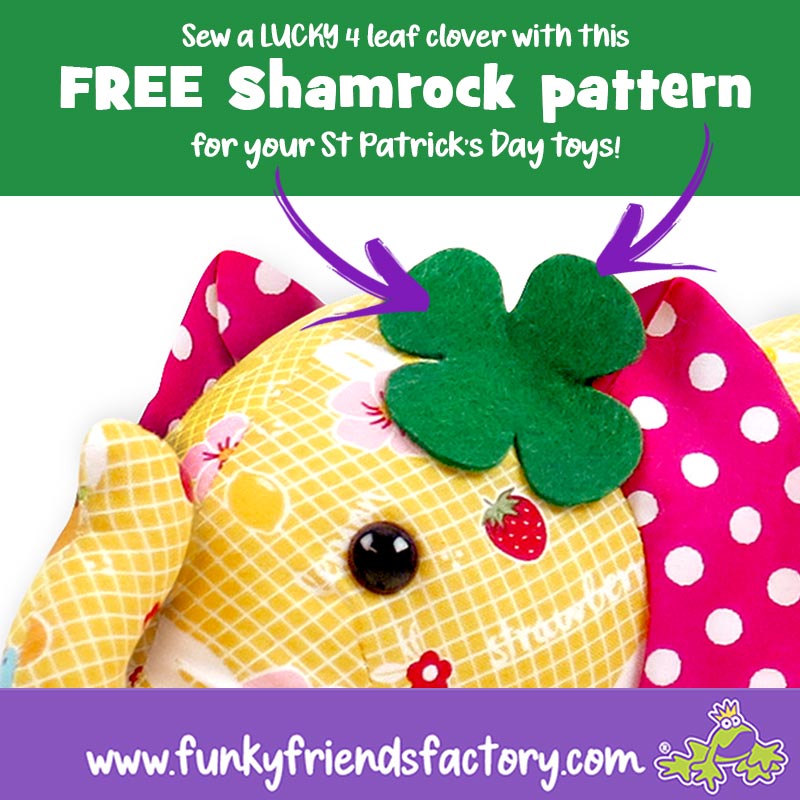 Looking for a free Shamrock pattern for St Patrick’s Day toys? Now you can make ANY Funky Friends Factory toy their own lucky 4 leaf clover or shamrock from felt. I have made a selection of sizes so you can choose a shamrock size, according to the size of the Funky Friend you’re sewing.