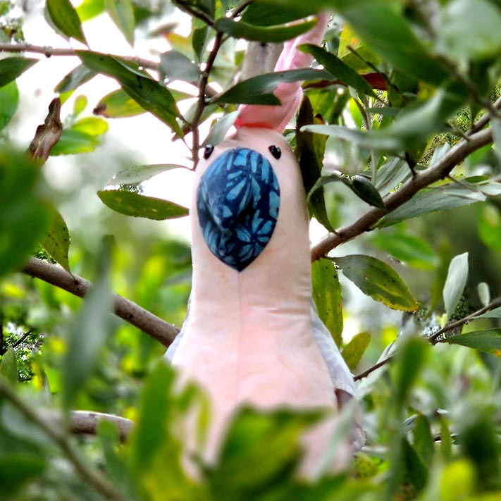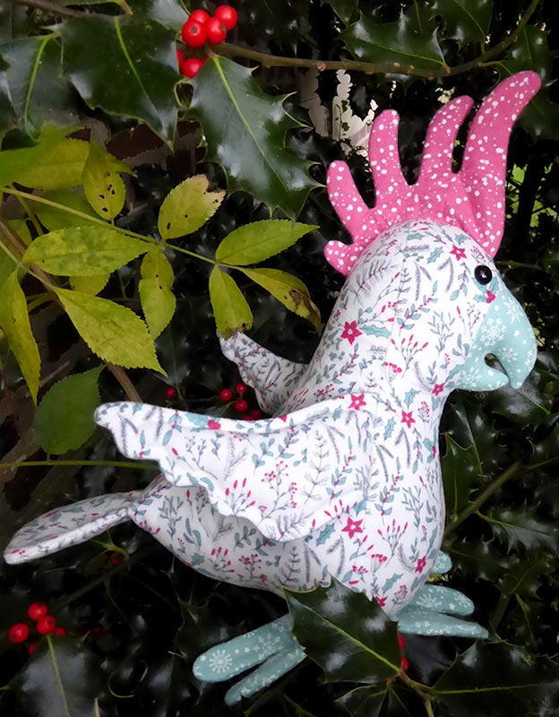 Almira.S had such fun sewing Charlie Cockatoo, she sewed another with a pink crest and she called her Charlene. Here she is perched in a Holly bush!
