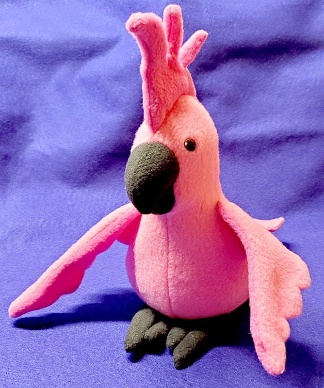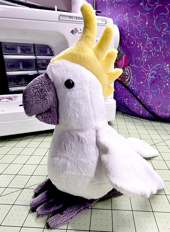 What a perfectly coordinated bird! Melissa Cochrane used a tie dye, long-pile minky for the body on this Charlie Cockatoo and matched the beak in a solid purple. The grey feet are made from a lower pile minky..