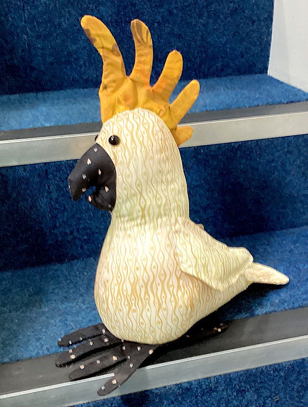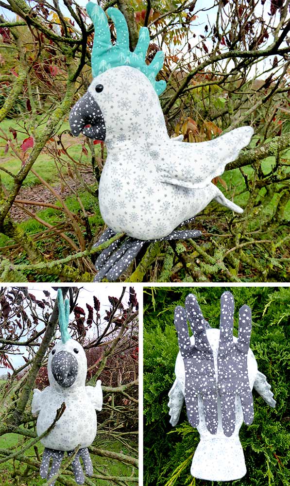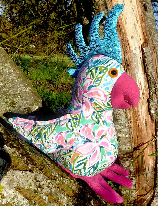 Here’s a different take on a faux feathers look, as sewn by Sandy Thurlow. I love the fabrics she has chosen for her Charlie Cockatoo – a wavy pattern (like the one on the body of this toy) can look like feathers.