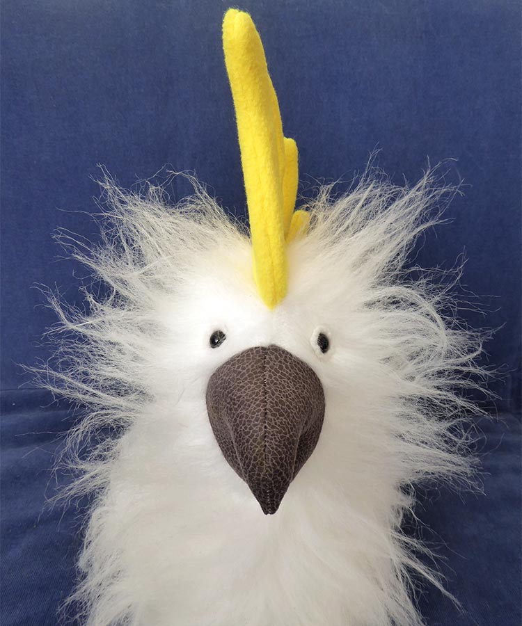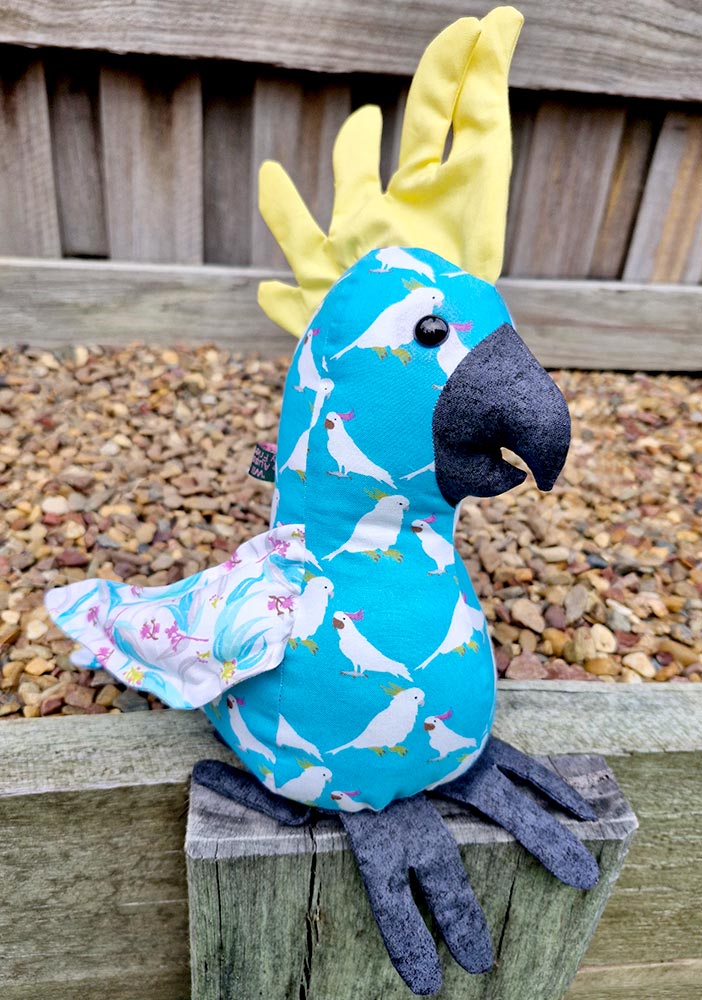 Charlie Cockatoo is one of the “Aussie Mates” (Australian) Funky Friends toy patterns and he has been really popular with children who seem fascinated by his wacky Sulphur yellow crest. This blog post covers all of the vital details on Charlie Cockatoo, such as pattern size, difficulty level, the best fabrics to use, how to achieve the look of feathers, and examples of Charlie sewn in both realistic and wild colors.