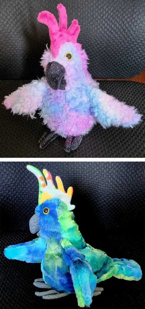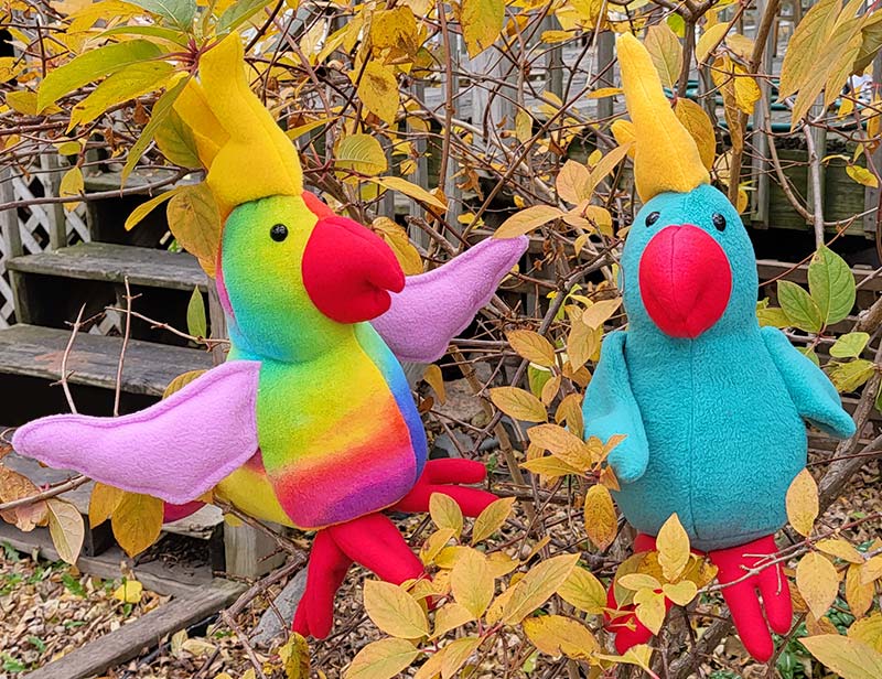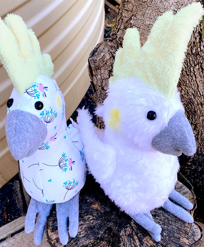 Another feathery option is low-pile fake fur, which you can see on the Charlie Cockatoo on the right below, sewn by Janet Radke. The bird on the left is made from quilting cotton, and both toys have a Sulphur crest made from minky, which comes in various levels of fluffiness depending on the brand. Minky is often more of a “baby chick” level of fuzz. The beaks and feet on both of these toys are made from fleece.