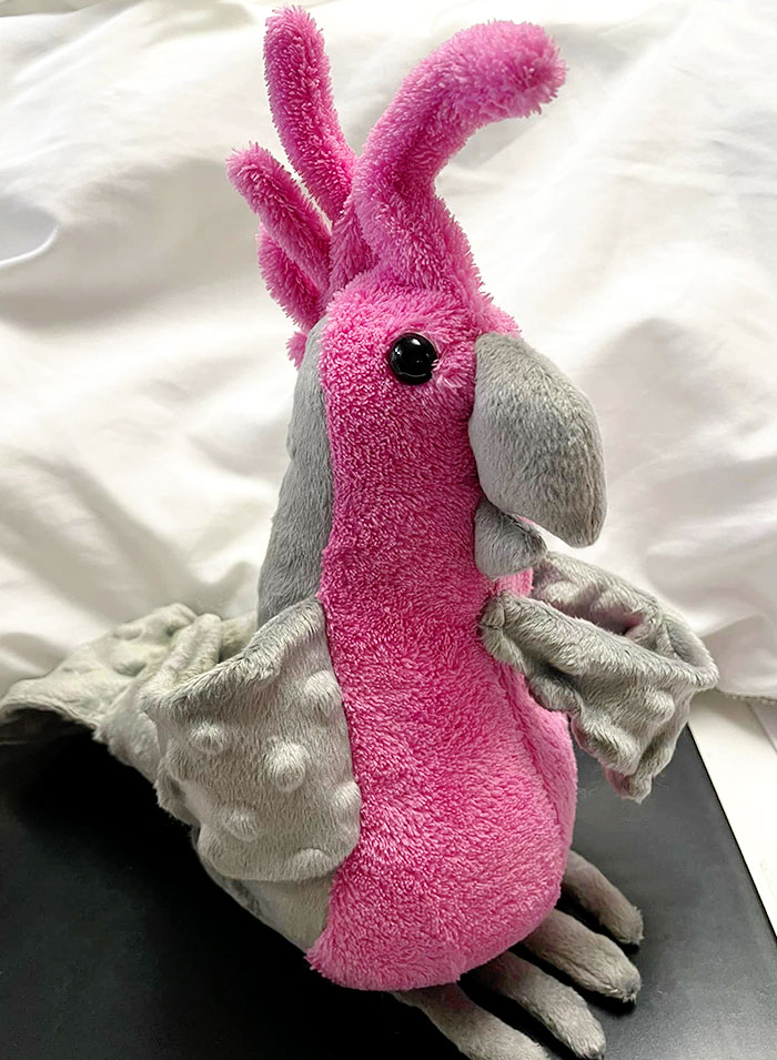 This pink and grey version of Charlie Cockatoo is posed as if he’s making a grand speech. Kathy Vorse Dickinson used a variety of fabric textures on this toy, including grey dimple minky, grey fleece, and a Terry cloth-like pink that resembles feathers. It must have been messy to sew, but the effect is worth it!😁