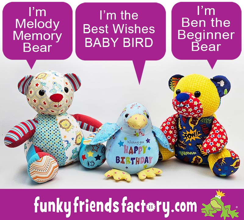 AND here he is hanging out with some of the Funky Friends Factory Bears – Melody Memory Bear and Ben the BEGINNER Bear. So he’s a fair bit smaller than a memory bear BUT he has lots of space for adding embroidery and other embellishments.