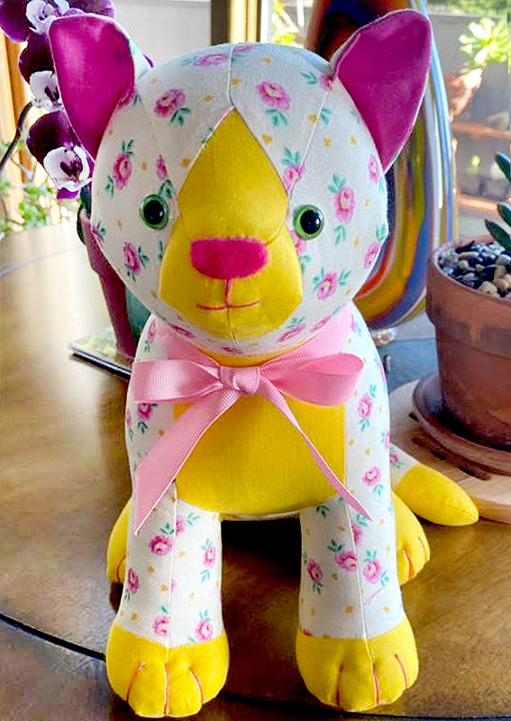 This Socks the SITTING Cat was sewn by Sandra Hughes. She used Tula Pink’s flower fabric and picked up the yellow and pink for the highlights.π©·π
