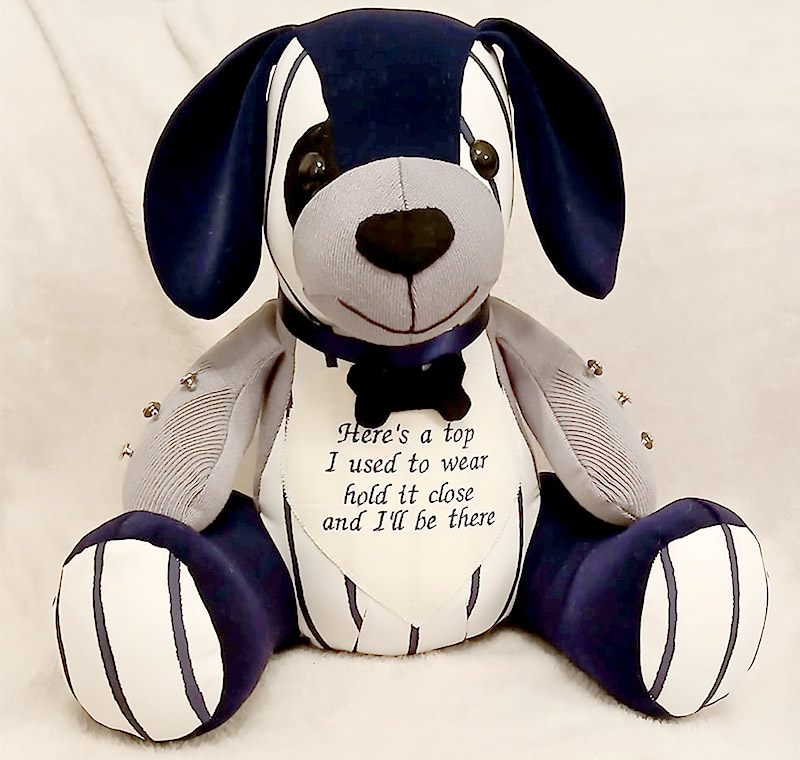 This Kip the Keepsake Dog sewn by Diane Cox… she has included the silver studs from the clothing she used to make this keepsake.Β