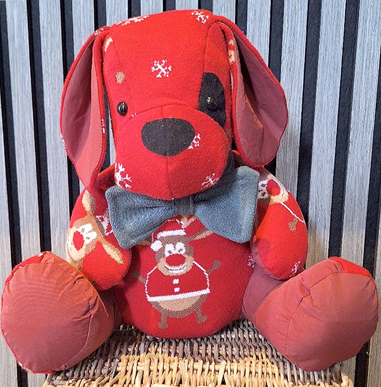 And Sarah Yates sewed this very festive Kip Keepsake Dog. from pre loved baby clothes for a Christmas keepsake.π π