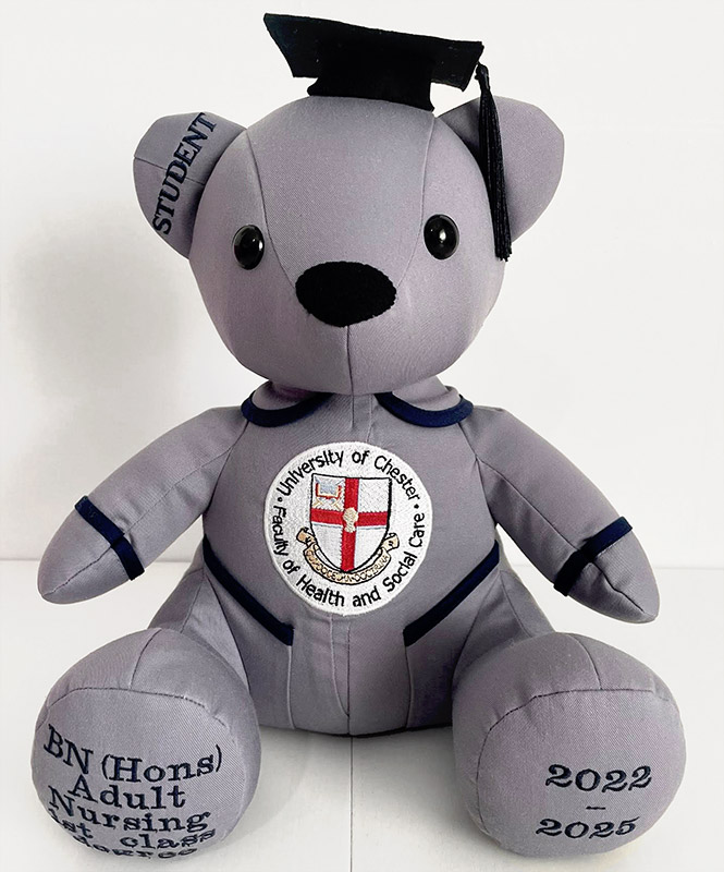 This Melody Memory Bear Pattern was sewn by Julie Lee as a uniform keepsake. She added a grad cap using the free pattern (see the link below the photo!)