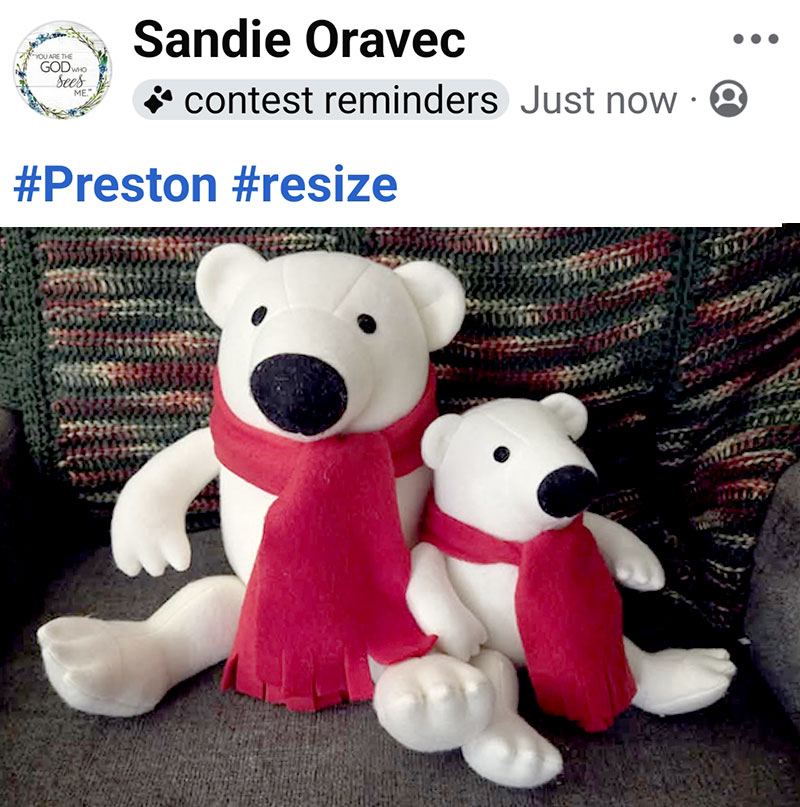 Sandie Oravec sewed these 2 Preston Polar BearΒ friends – one at 100% and a smaller Preston Polar bear at 65%.