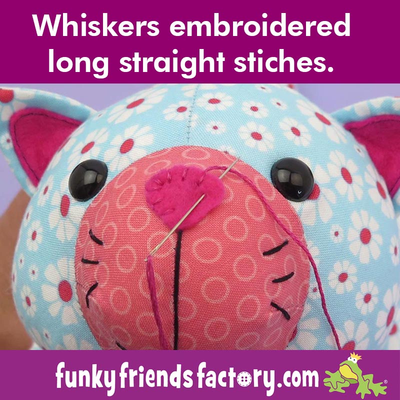 I like to add the whiskers AFTER the toy is stuffed. Why? This is so that I can make sure the face is even when I am stuffing and also so I can be sure exactly where I am sewing them on! I usually hide the starting and finishing threads UNDER a felt nose or ‘pop’ my finishing knot inside the toy between the stitches of a seam.