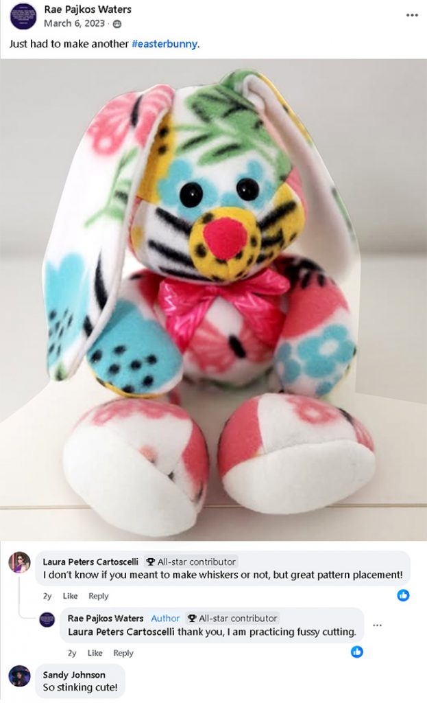 Sometimes you may get lucky and have fabric that has perfect lines on it to use for whiskers. Position your pattern pieces to take advantage of these designs like Rae Pajkos Waters did here on an Easter Bunny Buddy.