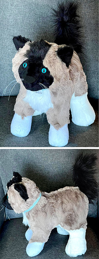 Debbie Hendricks-Weideman used black upholstery thread for her Patch Pussy Cat made out of Shannon Cuddle Luxe Artic Lynx fabric. Upholstery thread usually comes in whisker-friendly colors like white, tan, brown, and black.