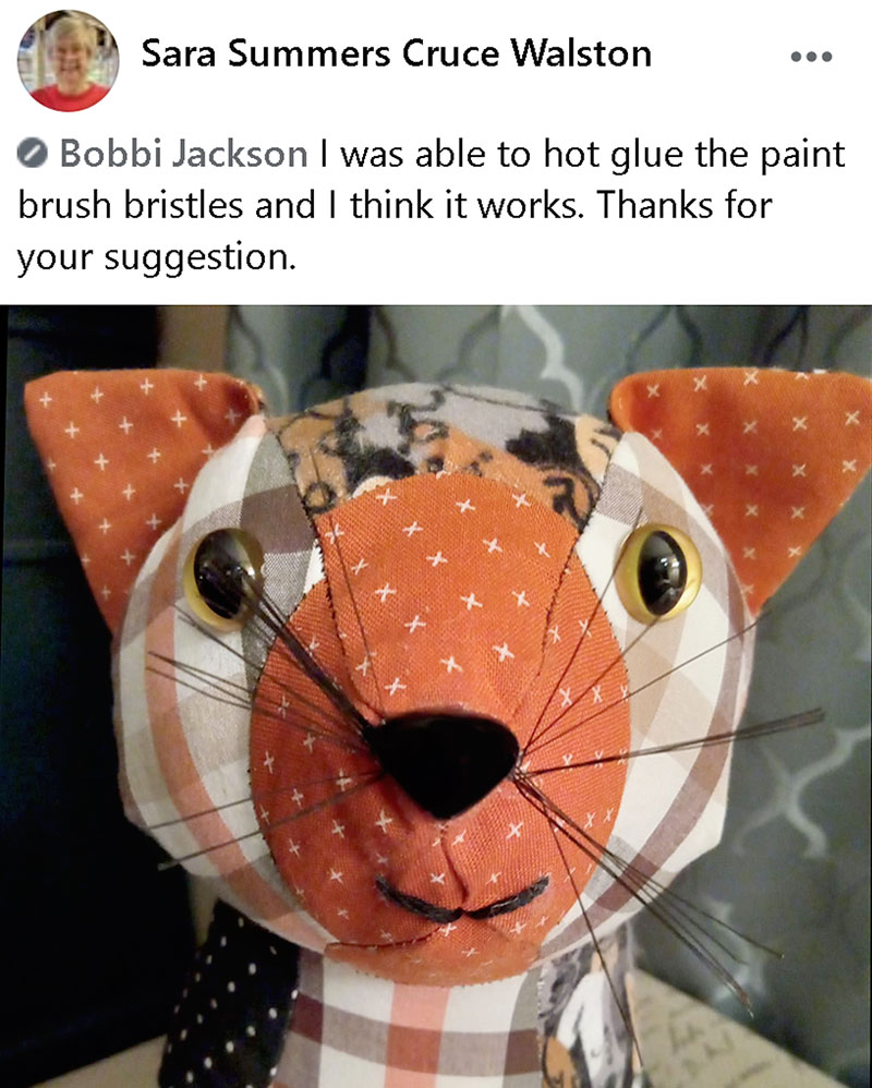 Sara Summers Cruce Walston used Bobbi Jackson‘s tip posted in our Pattern Fan Club Group (I have pasted this tip below Sara’s cat photo) and used paint brush bristles to add whiskers to her Patch Pussy Cat.