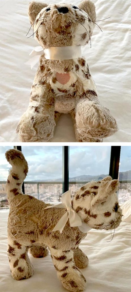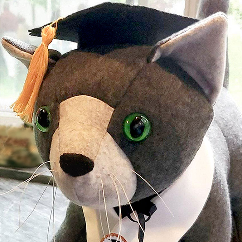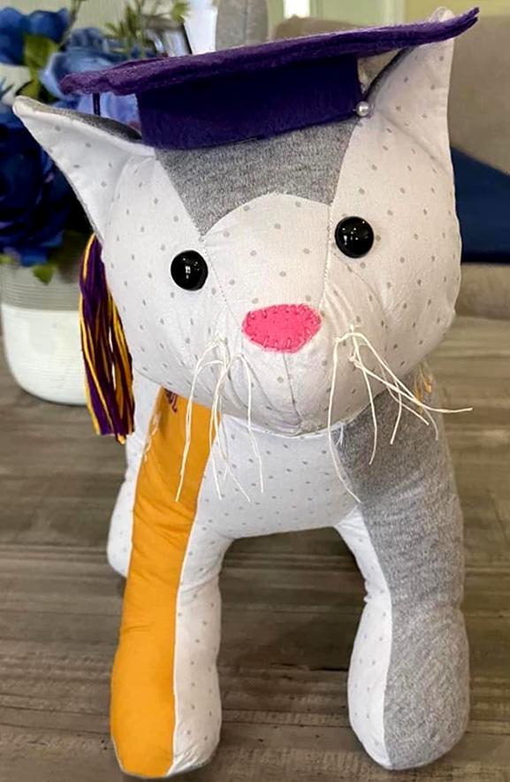 You may already have upholstery thread in your sewing room from making joints for Kelsey Keepsake Unicorn or Calico Bear! Upholstery thread is a popular choice for whiskers because it has a firm texture that makes it stand out on its own from the toy, but it’s not as scratchy as plastic options. Donna Gasparetto-Kirk used white upholstery thread for her school graduation keepsake version of Patch Pussy Cat.