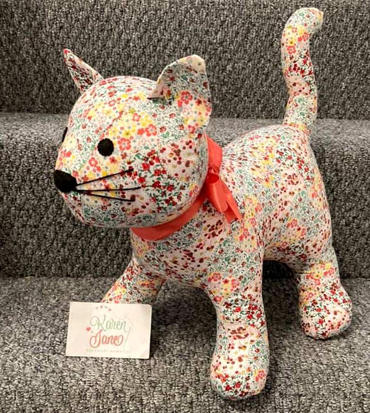Karen Cooper used black Anchor no 8 cotton thread to embroider some lovely long whiskers on her floral Patch Pussy Cat. The eyes are embroidered too so this makes the toy baby-safe too!