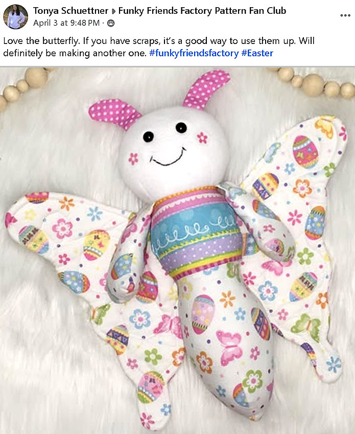 Tonya Schuettner sewed this cute Belinda Butterfly in Easter themed flannelette fabric. I love how she added flowers as the blush on Belinda’s cheeks.