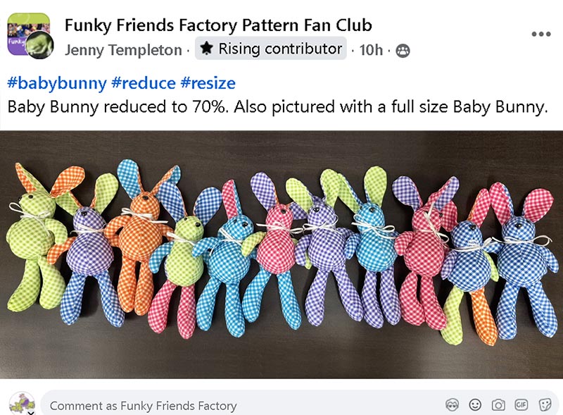 Jenny Templeton went ‘all out’ this year and sewed ELEVEN Baby Bunnies. I wonder if a bunny bunting trend could be a thing?π (If you want to know how to shrink (reduce) the size of a pattern to make the toy at a smaller size – check out the TIP below the next photo.)