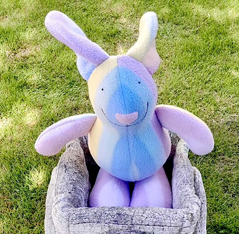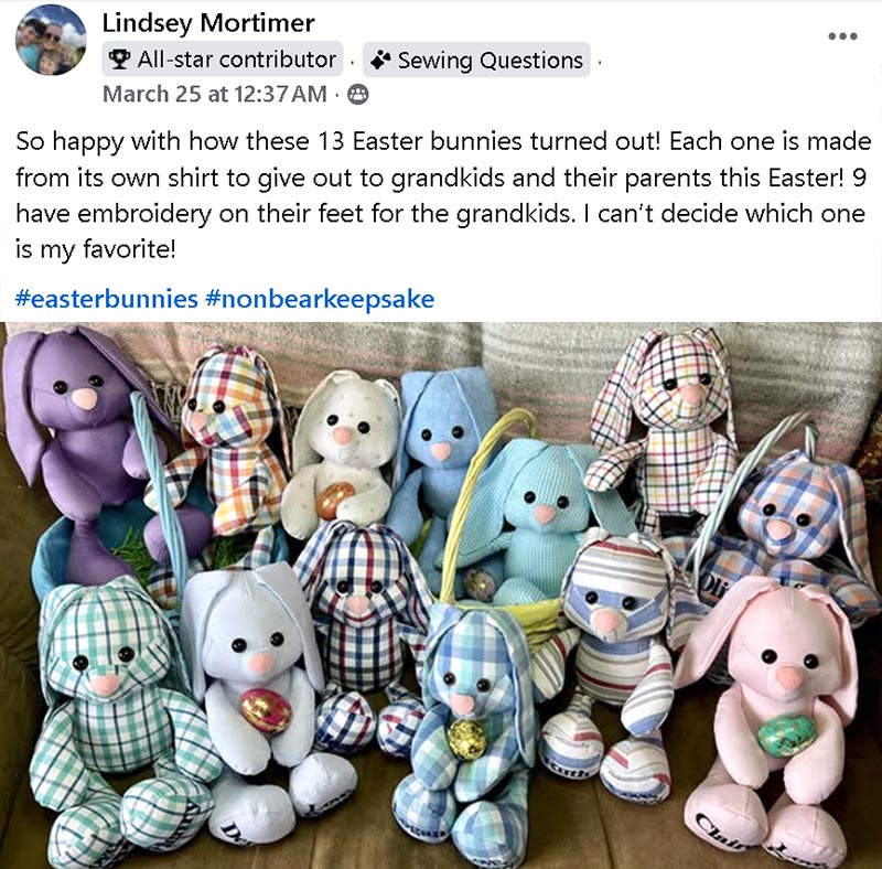 WOW! Lindsey Mortimer has been very busy! She sewed 13 Easter Bunny BuddiesΒ this Easter – some with the grandkids name embroidered on the feet! This pattern makes a great option for clothing keepsakes, whether you use baby clothes or men’s shirts as in the photo below.