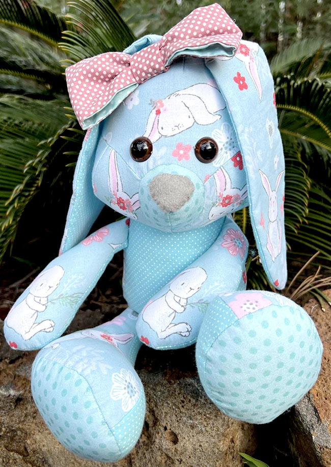 The cute face, floppy limbs, and plentiful options for personalization make this bunny a sweet treat all year long. Sweet bunny fabric and an adorable bow make Ann Donohoe’s version of theΒ Easter Bunny Buddy pattern a stand-out. Notice how Ann perfectly placed bunny images on the forehead and arms. The polka dots make for a fun contrast fabric, too.
