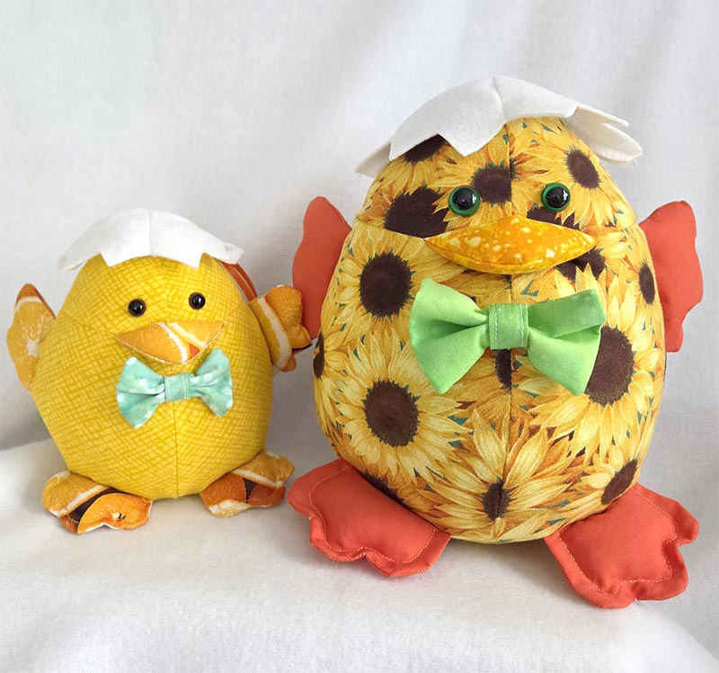 Ann Balthaser sewed 2 Egghead the Easter Chicks – one at normal size and the other at a reduced size. They both look ready to flap their wings and try flying.
