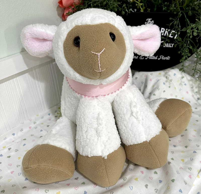 I’m loving this little Lamkins Lamb sewn by Joanne Williams. She sewed this sweet baby keepsake toy out of baby clothes! She incorporated buttons, ribbons, and other aspects of the clothing into the toy.