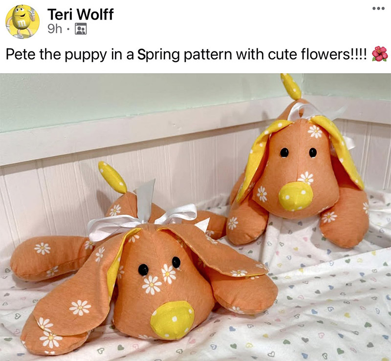 Teri Wolff used a fun floral fabric for Puppy Dog Pete. With this orange and yellow fabric, they remind me of sunshine on a spring day…complete with flowers.